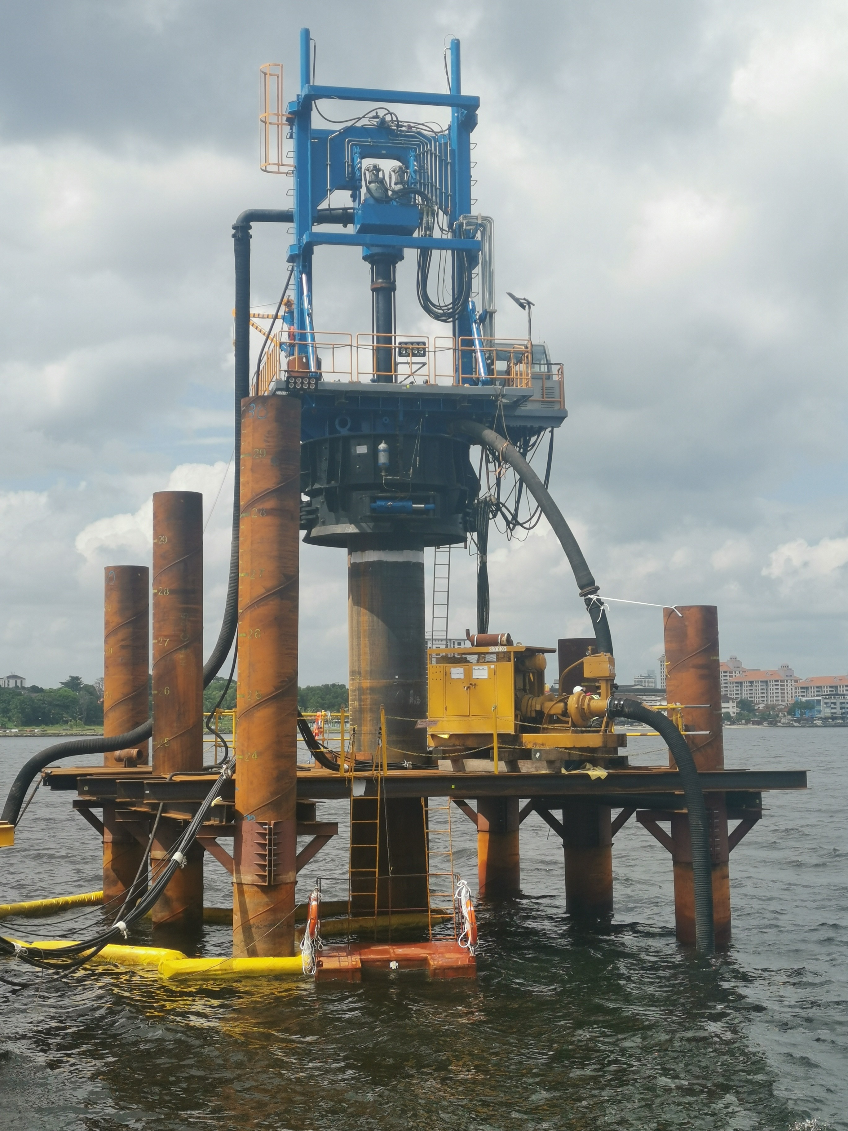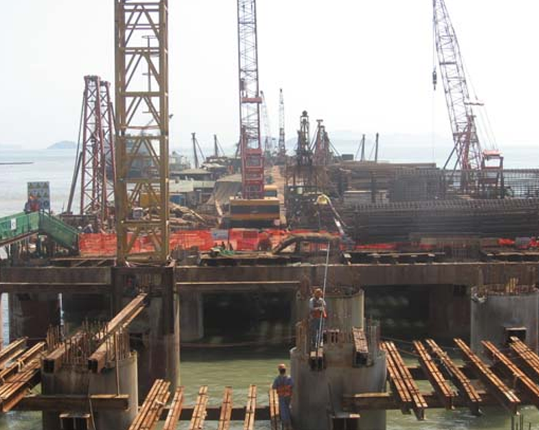 2012年12月至2013年10月,我公司配合中交三航局完成了港珠澳大橋島隧工程東人工島與香港方向連接的非通航孔橋墩嵌巖樁施工,這是我公司全部采用液壓回轉(zhuǎn)鉆機進行施工的又一施工典例。