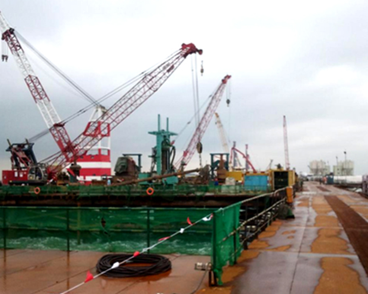 2016年3月我公司承擔(dān)了在舟山-秀山島附近我國第一座(世界單機最大容量)3.4兆瓦”潮流發(fā)電總成平臺“樁基(包括直樁、斜樁)嵌巖樁施工。在此工程中我們克服了流急(每秒-5m)、漩渦等自然條件,成功地在海底中風(fēng)化裸巖上進行了準(zhǔn)確無誤的施工。